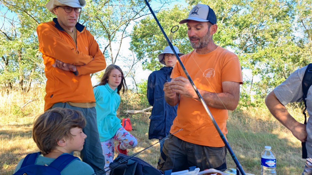 Nous étions quatorze samedi matin à rejoindre Cédric Dubois, guide de pêche au lac du Cébron pour notre cours de pêche d’été en lac. Il nous a montré les différents leurres à utiliser et comment les animer : spintail, dropshot, spinnerbail, cuillère ….
