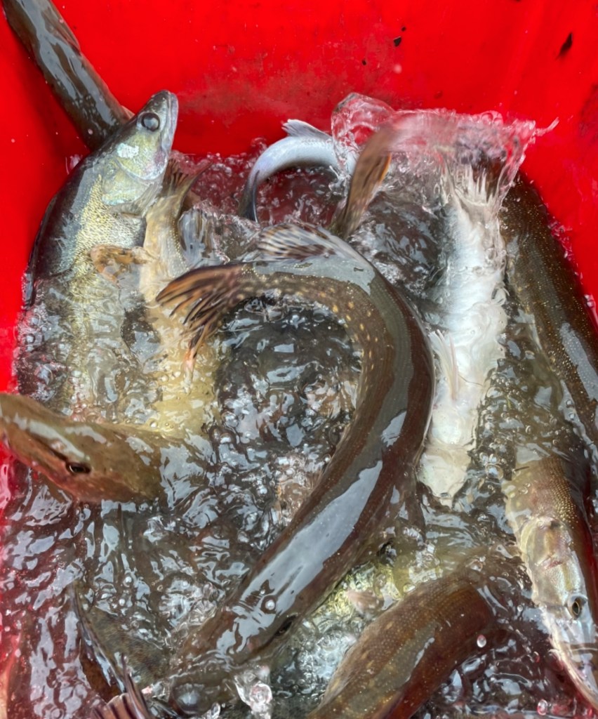 En ce début de mois de décembre, les bénévoles de la Maraichine ont lâché 50 kg de brochets et 30 kg de magnifiques sandres sur divers points du territoire de pêche, afin de soutenir la population et la reproduction. La pisciculture n’avait pas réussi à produire des perches cette année.